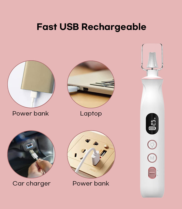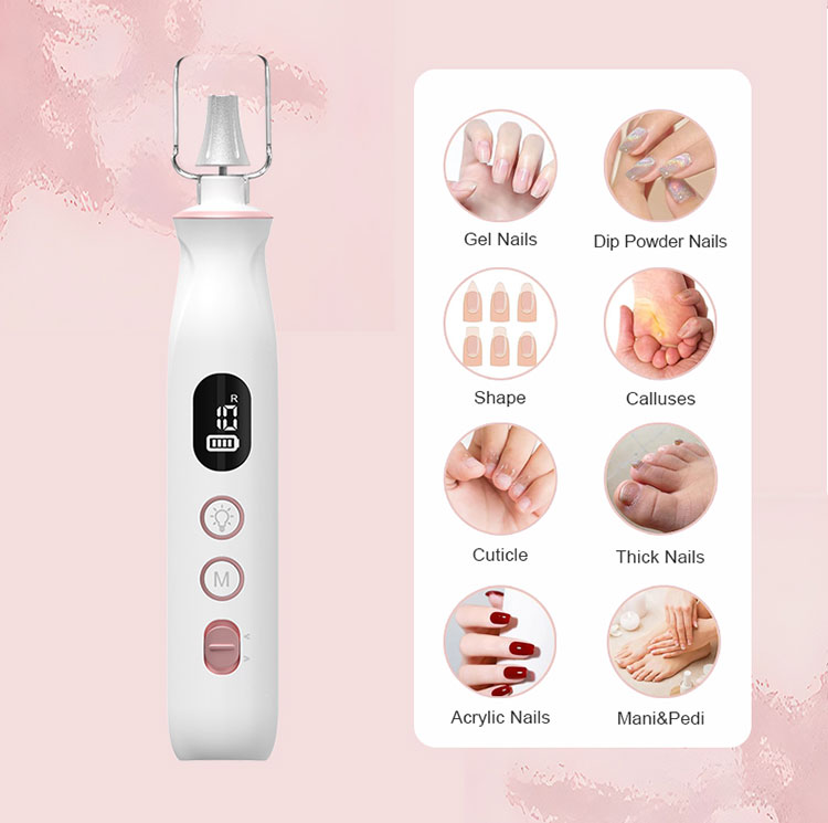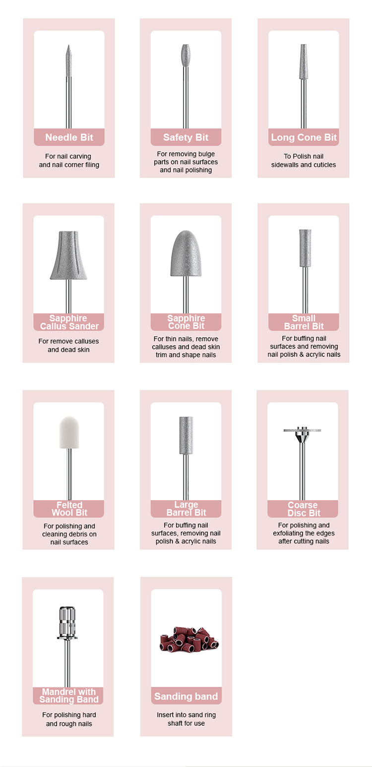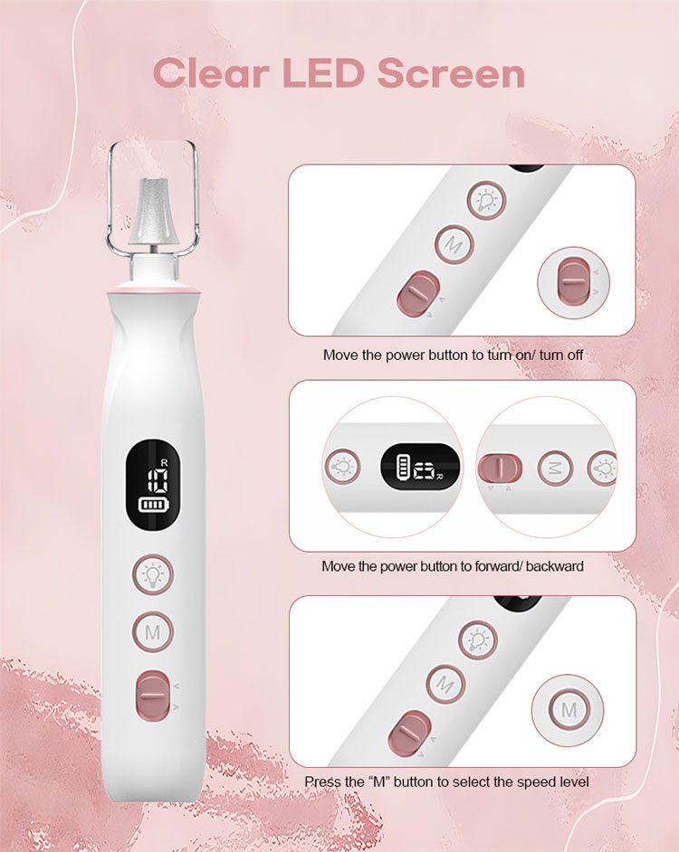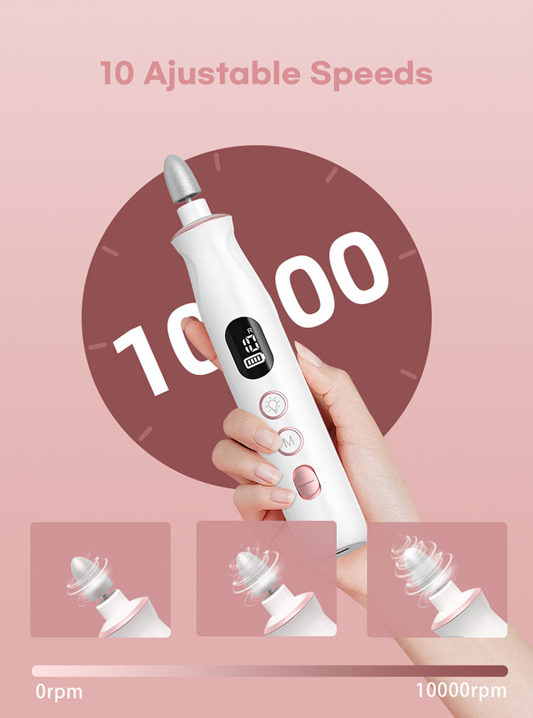 4:Nabíjecí a akumulátorová: Akumulátorová vrtačka na nehty je vybavena bateriovým napájením, poskytuje skvělou přenosnost a více než 6 hodin provozu na plné nabití. A pokud potřebujete více času, můžete jej používat i během nabíjení