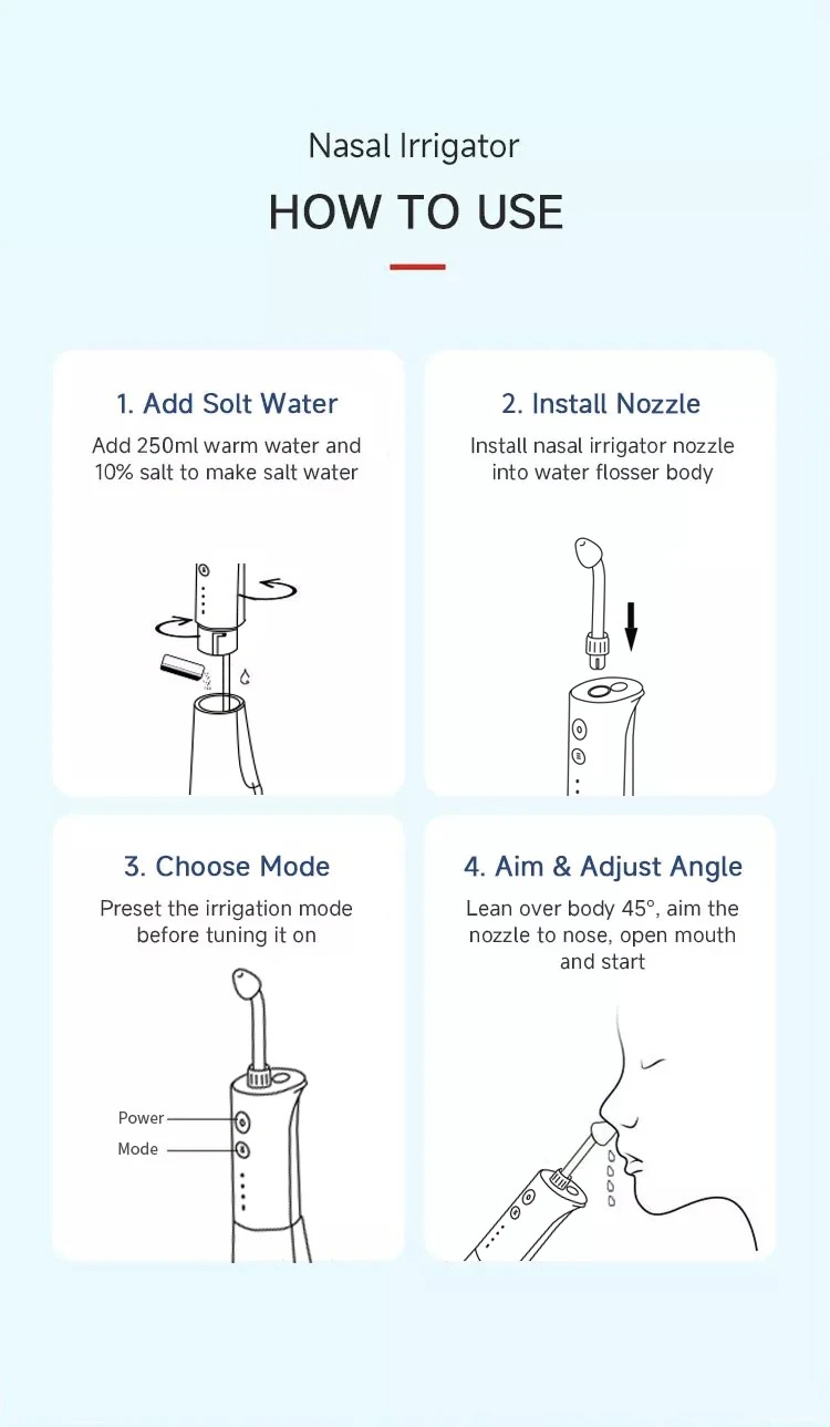 Efektivní nosní výplach: Elektrické nosní výplachy nabízejí účinné a důkladné výplachy nosních cest, pomáhají vyplavovat hlen, alergeny a nečistoty efektivněji než manuální metody. Pohodlí: Elektrické nosní výplachy díky svému poháněnému provozu a nastavitelným nastavením poskytují pohodlné řešení pro výplach nosu, což uživatelům šetří čas a námahu ve srovnání s technikami ručního výplachu. Přizpůsobení: Nastavitelné nastavení elektrických nosních výplachů umožňuje uživatelům přizpůsobit si výplach tak, aby vyhovoval jejich individuálním potřebám, preferencím a úrovni pohodlí.