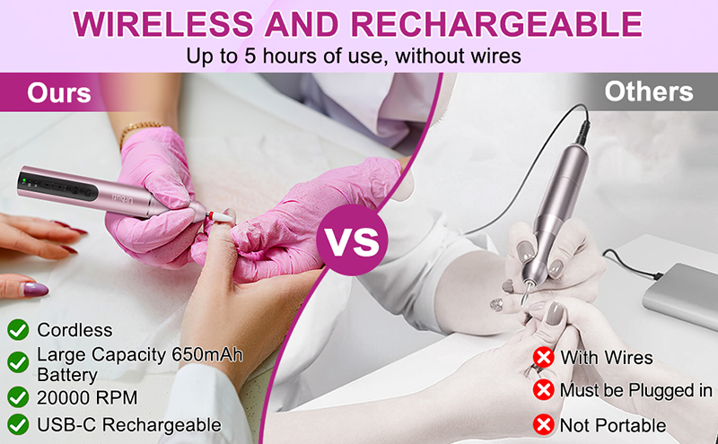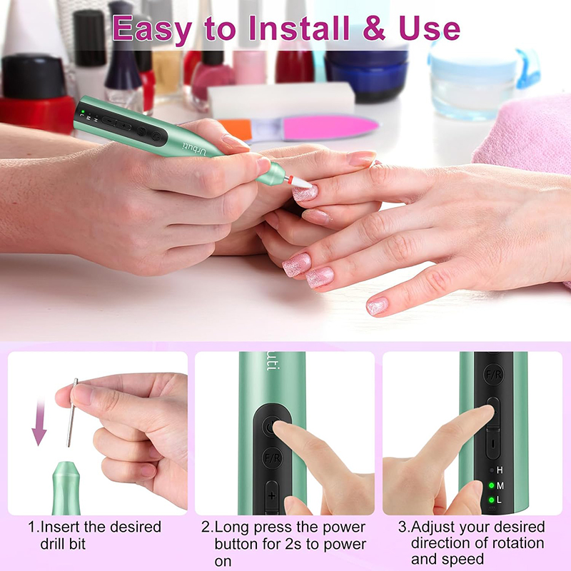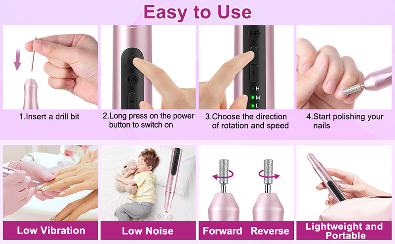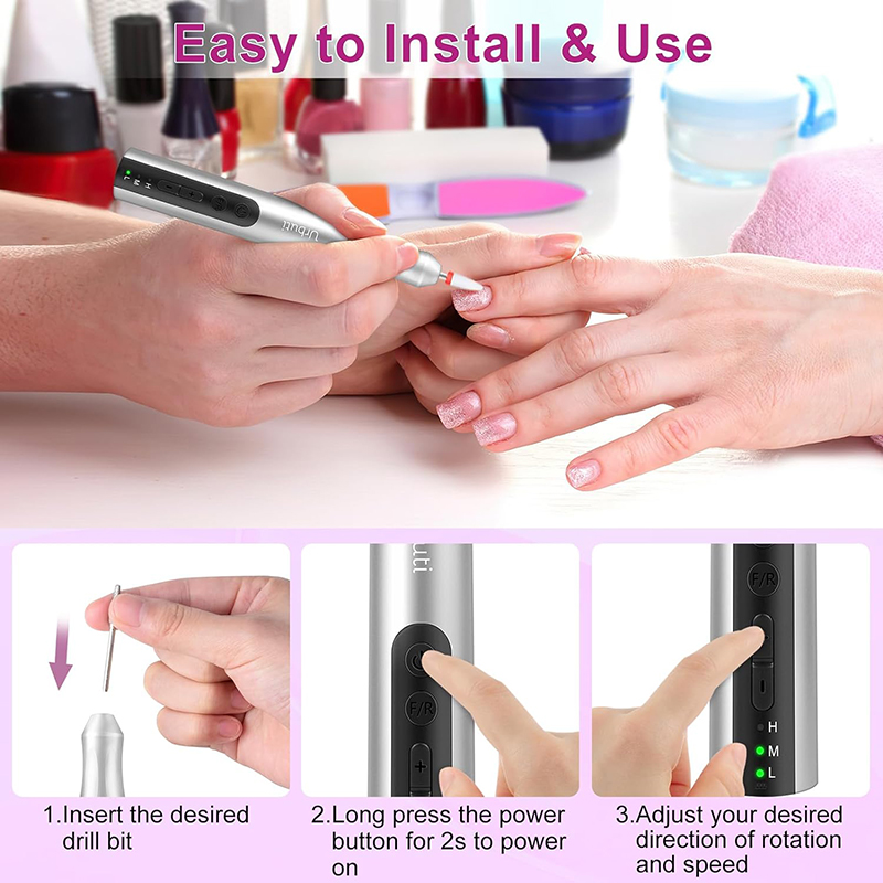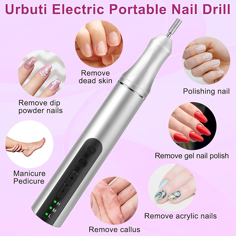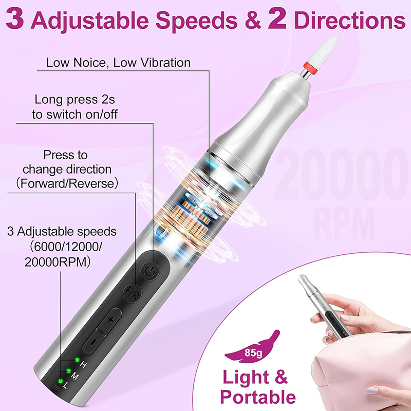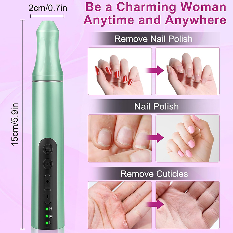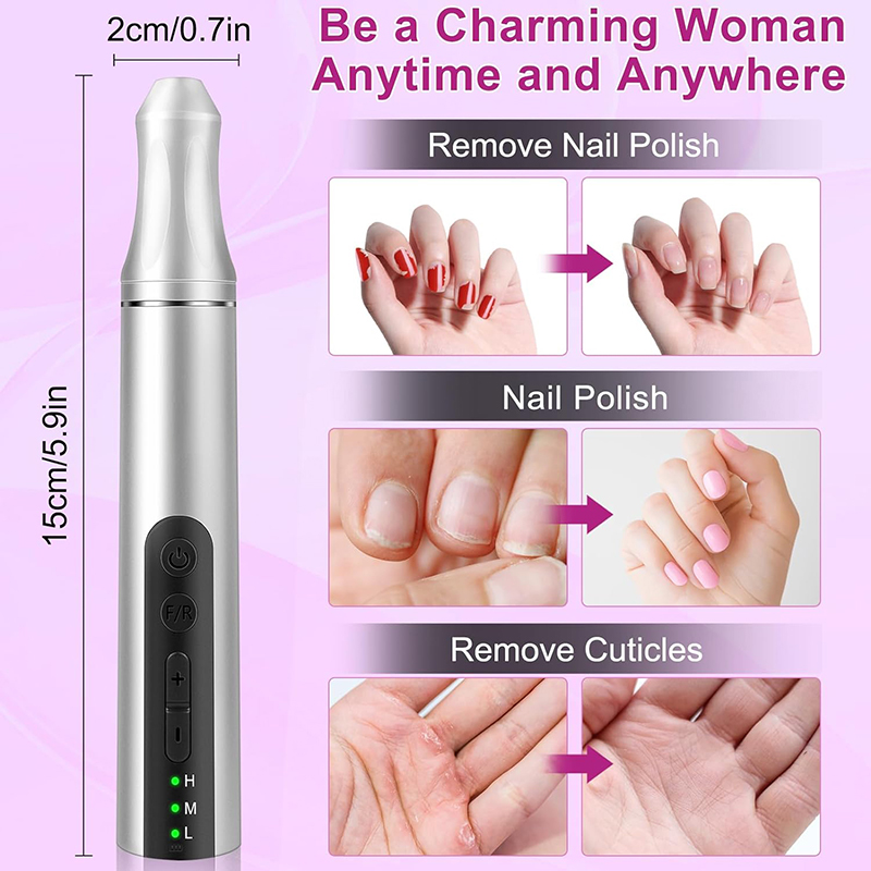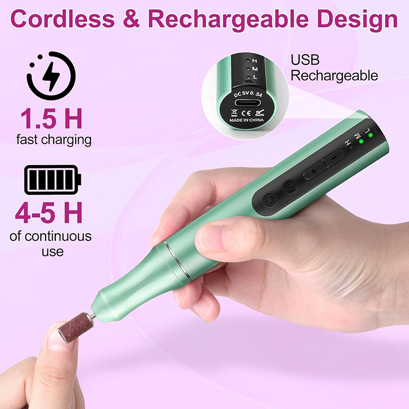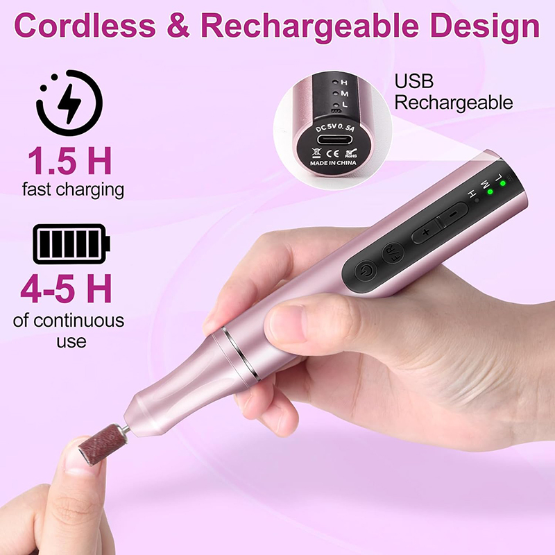 Vrták na akrylové nehty je navržen tak, aby byl lehký (85 g) a vejde se do kabelky nebo kapsy na oblečení. Dodává se také s nabíjecím kabelem USB, který lze snadno zapojit do jakéhokoli zařízení USB a nabíjet, takže je pro vás pohodlné užívat si péči o nehty kdykoli a kdekoli.