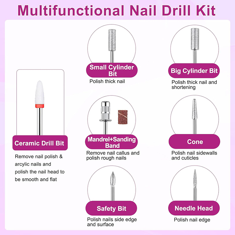 Vrtačka na nehty obsahuje 6 vrtáků z nerezové oceli, 1 keramický vrták a 36 vyměnitelných brusných pásků. Sada na manikúru a pedikúru může být použita pro manikúru, pedikúru, leštění, tvarování, broušení kůžičky, odstraňování akrylových/gelových nehtů nebo pro krásu nehtů. Kompletní s příslušenstvím a snadné použití, ideální pro začátečníky v nail art!