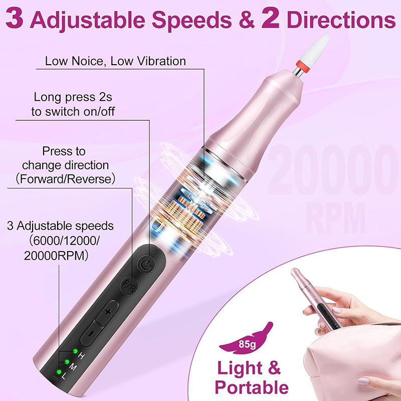 Pilníky na nehty Professional jsou navrženy se 3 rychlostmi 6000-12000-20000, stačí krátce stisknout tlačítko + nebo - pro zvýšení nebo snížení rychlosti. Snadné nastavení rychlosti a úspora času při broušení nehtů. Směr vrtání lze snadno změnit stisknutím tlačítka F/R, ideální pro leváky, mistry nehtů nebo začátečníky v péči o nehty.