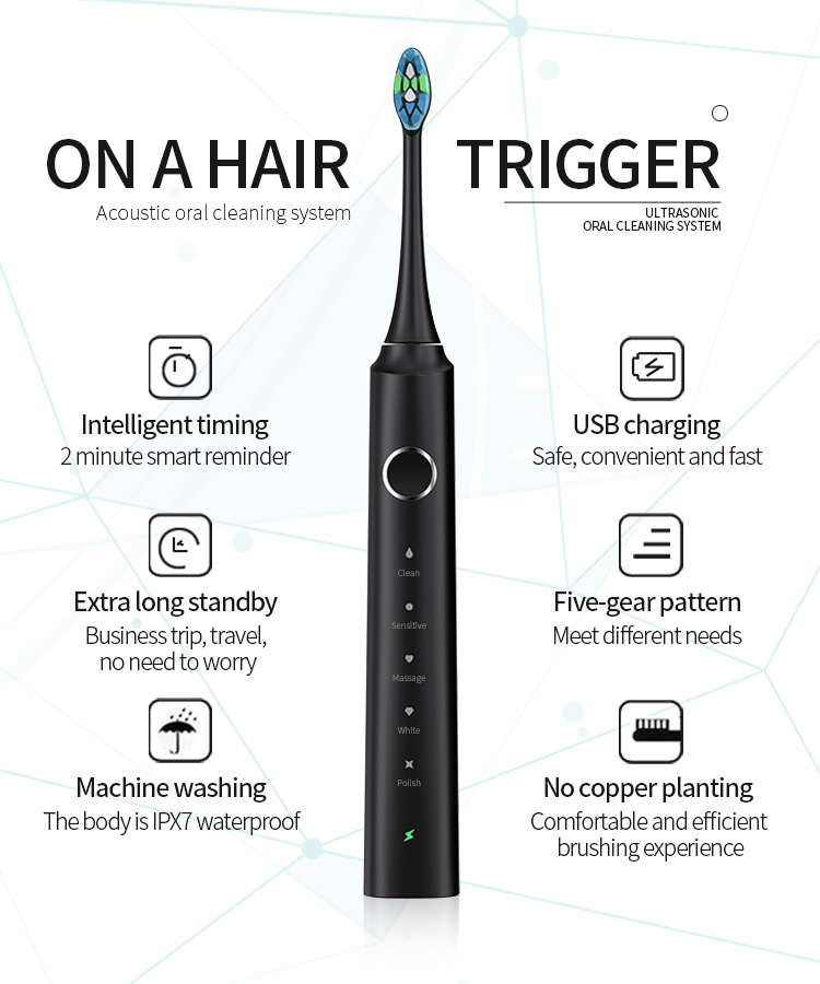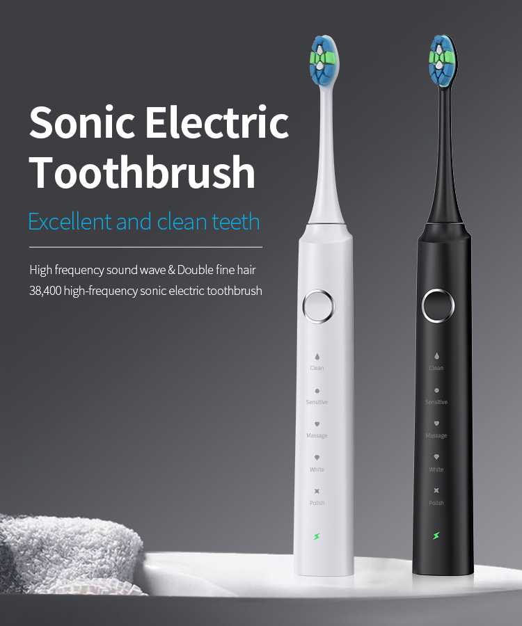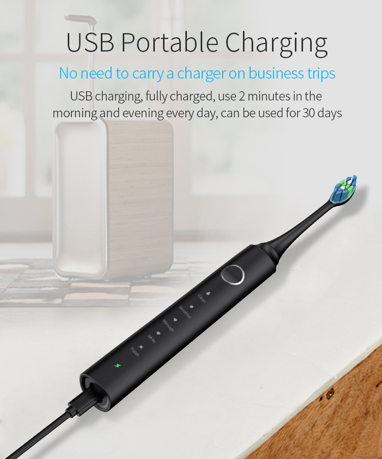 - 5 REŽIMŮ VYSOCE VÝKONNÉHO ČIŠTĚNÍ – Clean (jemný), White (silný), Polish (silná inverzní frekvence), Mírnější (jemná inverzní frekvence) a Sensitive (měkký), aby vyhovovaly různým stavům zubů dásní, takže si můžete vybrat různé režimy podle vašich preferencí a doporučení zubního lékaře.