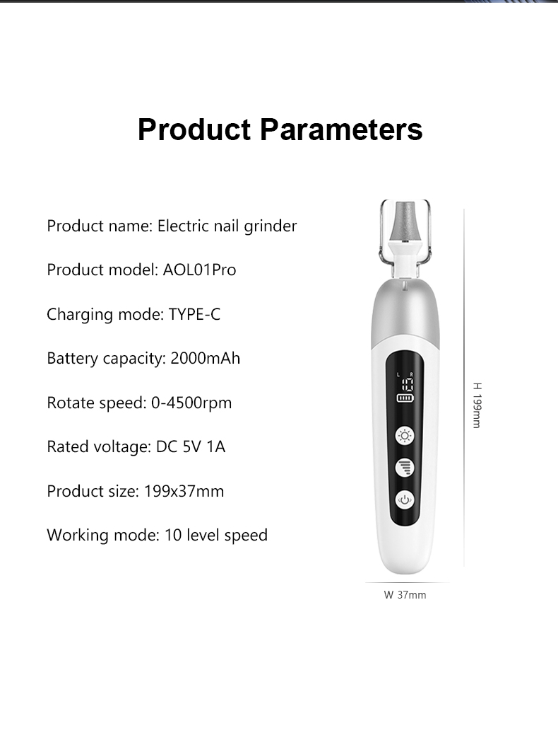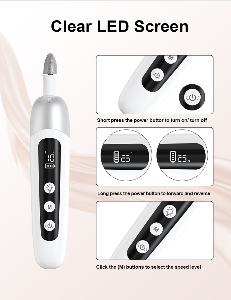 - INOVATIVNÍ LED DISPLEJ: Snadno procházejte požadovanými nastaveními. LED displej zobrazuje stav baterie, preferovanou rychlost a nastavení rotace pro snadné ovládání. Elektrický pilník na nehty je také vybaven integrovaným LED světlem, které osvětluje oblasti na rukou a nohou